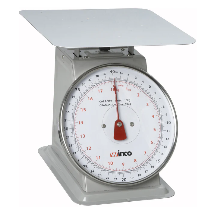 The Winware Mechanical Receiving Scale offers a 40 pound capacity making it ideal for checking weights when receiving product, meat, grains and more. The easy-to-read analog dial is clearly marked in both pounds and kilograms. This 40 pound food scale features graduation markings in increments of 2 ounce (100g). Made from heavy-duty stainless steel, this commercial food scale is designed to withstand daily use in restaurants, grocery stores and more.