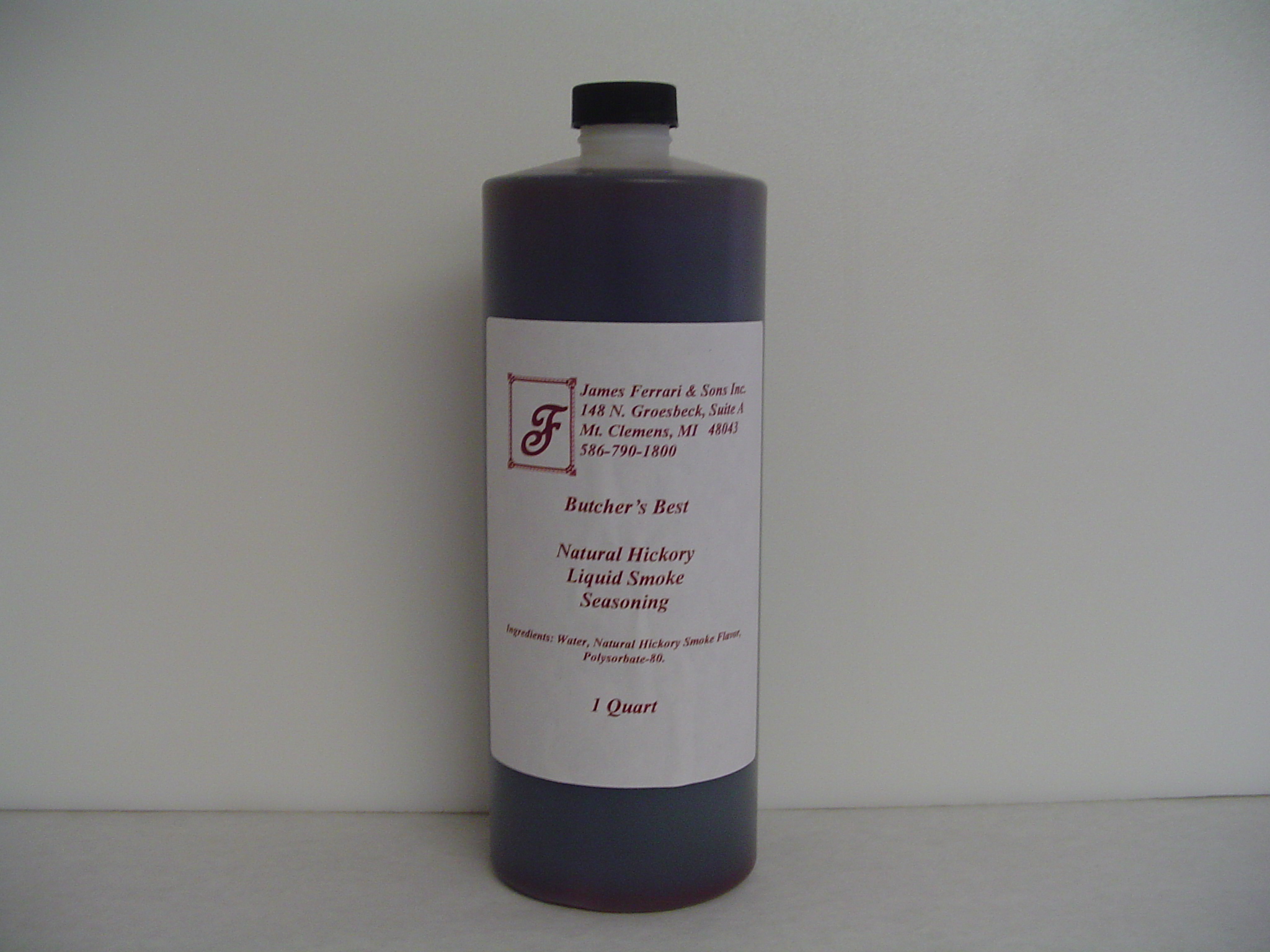 Ferrari’s Own Brand of Butcher’s Best Liquid Smoke Seasoning. 1 QT Bottle. Ingredients: Water, Natural Smoke Flavor and Poly-Sorbate 80.
